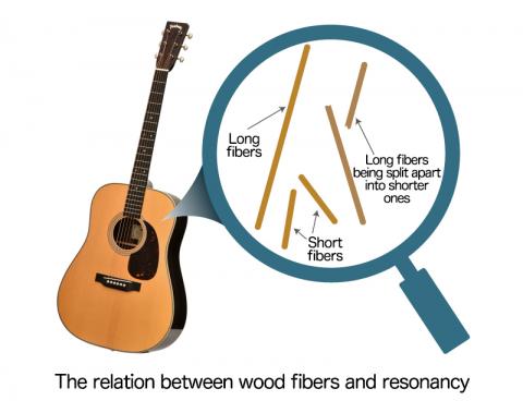 What makes a guitar sound good is the frequency characteristics of the wood from which it is made. Observing wood at a microscopic level reveals that the fibers of the wood are intricately folded and formed from short to long fibers. In fact, it is known that the longer the fiber on the wood is, the lower the frequency they resonate at is, and the shorter the fiber, the higher the frequency it resonates at is.