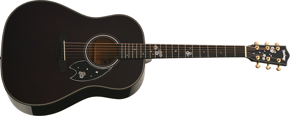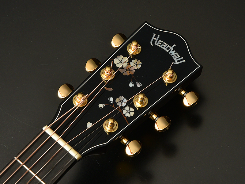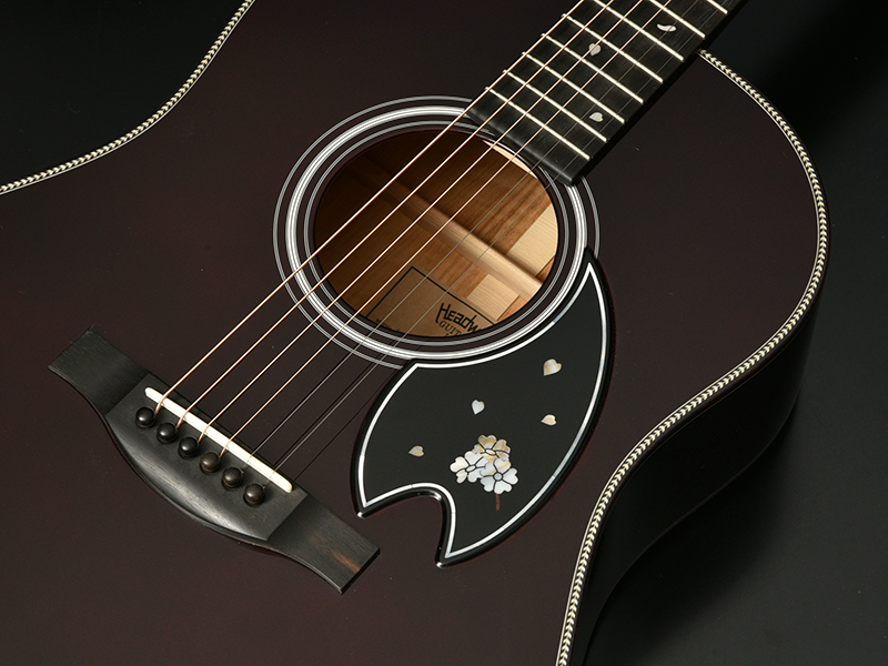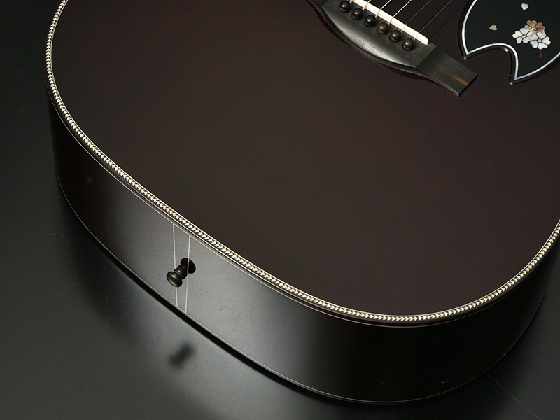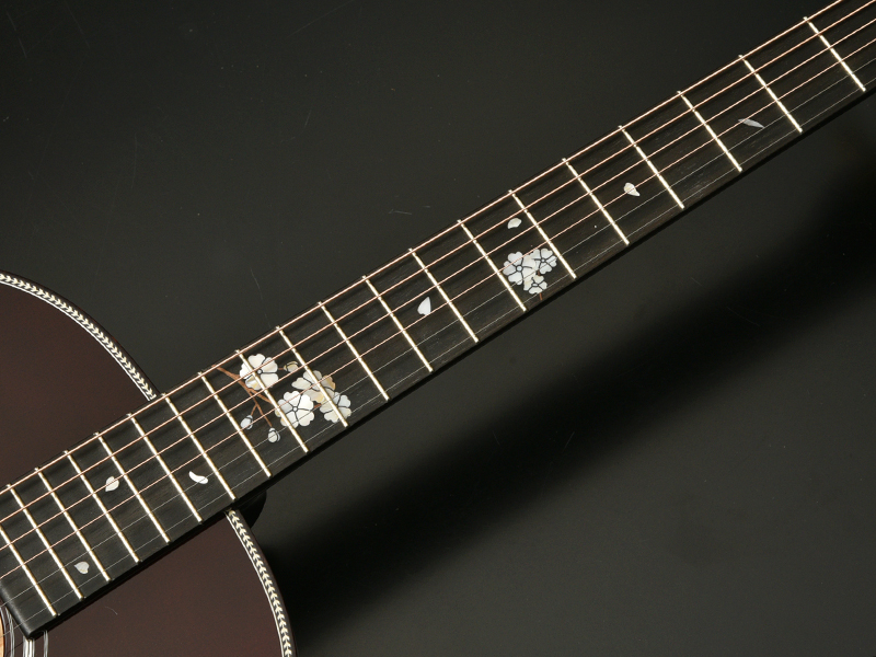 Sakura:飛鳥工場で使用される和材のなかでも特に人気の高い「桜」をボディサイドバックに採用しました。夜の月のわずかなあかりに輝く桜をイメージした、夜桜ブラックカラーで仕上げています。上品な指板インレイが印象的なモデルに仕上がりました。