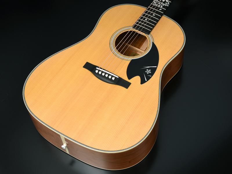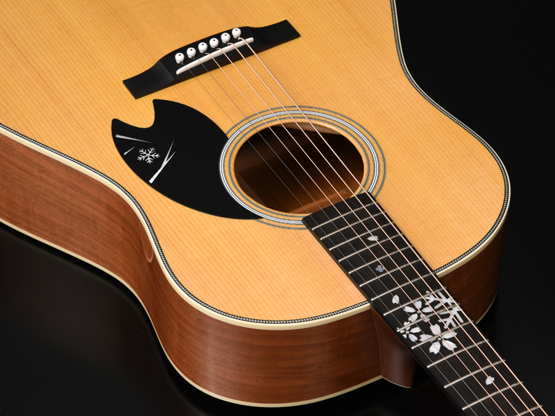 桜の木は適度な固さを持ち、各弦の分離、音のバランスが良いことを私たちは知っています。この桜の魅力を最大限に引き出すためにシトカスプルースをボディトップに使用し、スキャロップ・フォワードシフトXブレイシングを採用しました。また、雪の結晶と花びらをモチーフとする、ヘッドトップから指板にかけて広がる大胆なインレイワークがこのギターの大きな特徴。日本の四季を感じさせるFuyuzakuraモデルで桜の音をお楽しみください。
