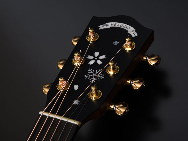 桜の木を使用したギターを不定期に制作するヘッドウェイが新たにお届けする「冬桜」をテーマにした新モデル。雪と桜がモチーフの新たなインレイが指板を彩ります。