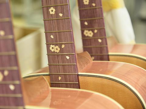 ボディのサイドバック材には桜の木を使用しています。適度に優しいニュアンスを持つ桜ギターのサウンドですが、ARS(アドバンスドリアシフト)Xブレイシングの影響からか、立ち上がり良く、音の粒立ちも揃いました。