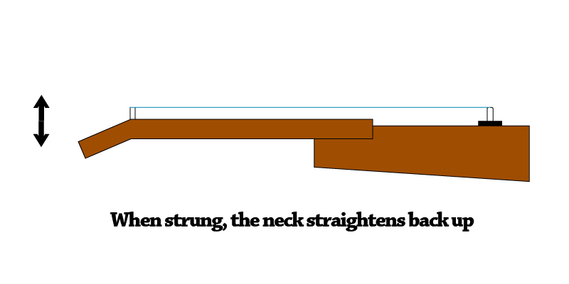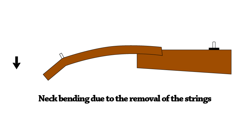 Normally, the neck of an acoustic guitar slightly bends in the opposite direction when the strings are removed. And there is a balance with the tension of normal tuned strings which apply several tens of kilograms of force that maintains the neck straight.