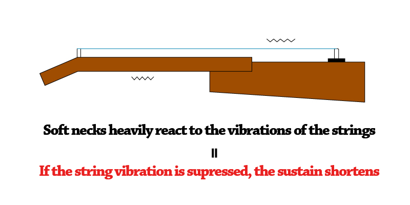 When the string vibrates as you play it, the neck moves accordingly, and the softer the neck is, the more it resonates with the vibration of the strings, and the damping of the string vibration becomes faster and the sustain drops.