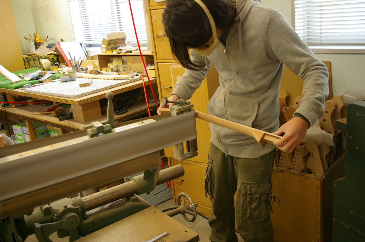 ギターの製作には非常に多くの工程を要します。現在、多くのギター工場ではコンピューター制御のNCルーターを使用し、大量に敏速な加工をしています。 NCルーターを使用すれば、時間をかけずに外見は均一な製品を大量生産することが可能だからです。しかし、木の質は決して均一ではありません。百瀬とクラフトマン達は「良いギター製作には、材の質量・弾力性・響きなどの個体差に応じた加工が必要だ」と考えています。