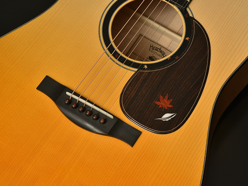 ボディに施したカラーリングは日本の四季の中でも一際情緒のある「秋」をイメージしたオリジナルグラデーションカラー。木材そのもののナチュラルな色から紅葉を思わせる朱色にグラデーションしていきます。ボディ全体の柔らかい暖色を、指板、サウンドホールロゼッタ、ピックガード、ブリッジのエボニーのナチュラルカラーが引き締めます。