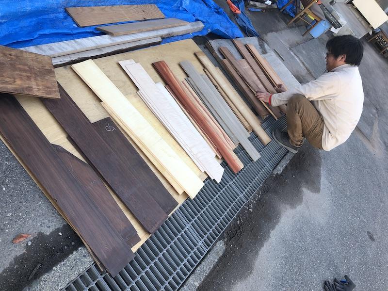 さて、年末も差し迫った今日、Headwayマスタービルダー安井雅人が広げているのは、このサウンドメッセに出展するための特別モデル計10本の素材です。
