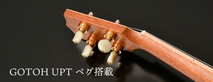 ストレートシャフトながら、内部にギアを持ちチューニングの安定性で群を抜くゴトー製UPTをペグに採用しました。伝統的なストレートのペグはギヤがなく、チューニングの際の音程変化が急で、調整が難しいという難点がありました。このUPTはギアを内蔵しながら見た目はストレートシャフトという伝統的な外観を保った画期的なペグです。