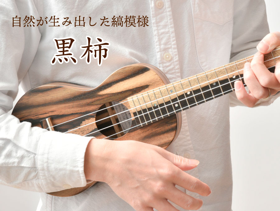 日本の歴史的美術工芸品を収蔵する奈良・正倉院の中にも、数多くこの木を使用した木工芸品が見られるように、古くから珍重されている「黒柿」。秋になると実をつけるあの柿の木ですが、ごく稀に黒い縞が現れる個体があります。見た目にも個性的で、一本一本その表情を大きく変えます。少し硬めの木材で、ウクレレらしいコロコロとしたサウンドをお楽しみ頂けます。