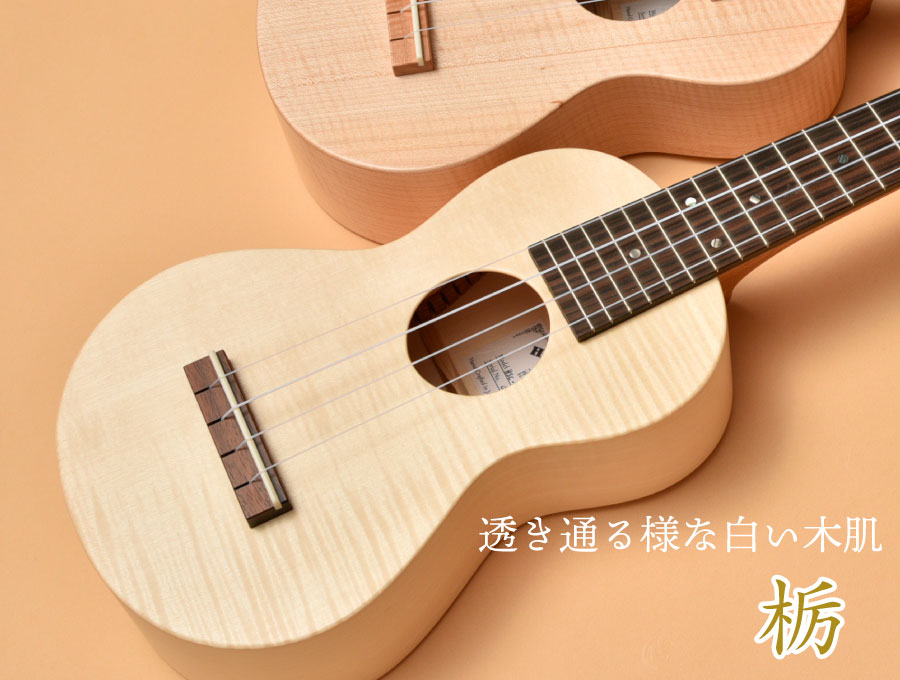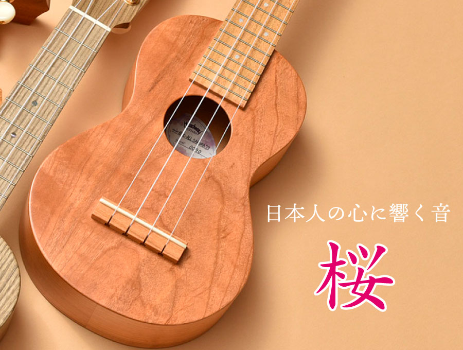 春に花を咲かせ、日本人の心に深く根付く桜。ボディだけでなくネックや指板にも桜を使った「オール桜ウクレレ」です。ポジションマークに桜の花びらをイメージさせるデザインを取り入れました。桜の木が持つ白い木肌に、桜をイメージさせるピンクカラーを少しだけ加えて、自然な桜色を表現しました。