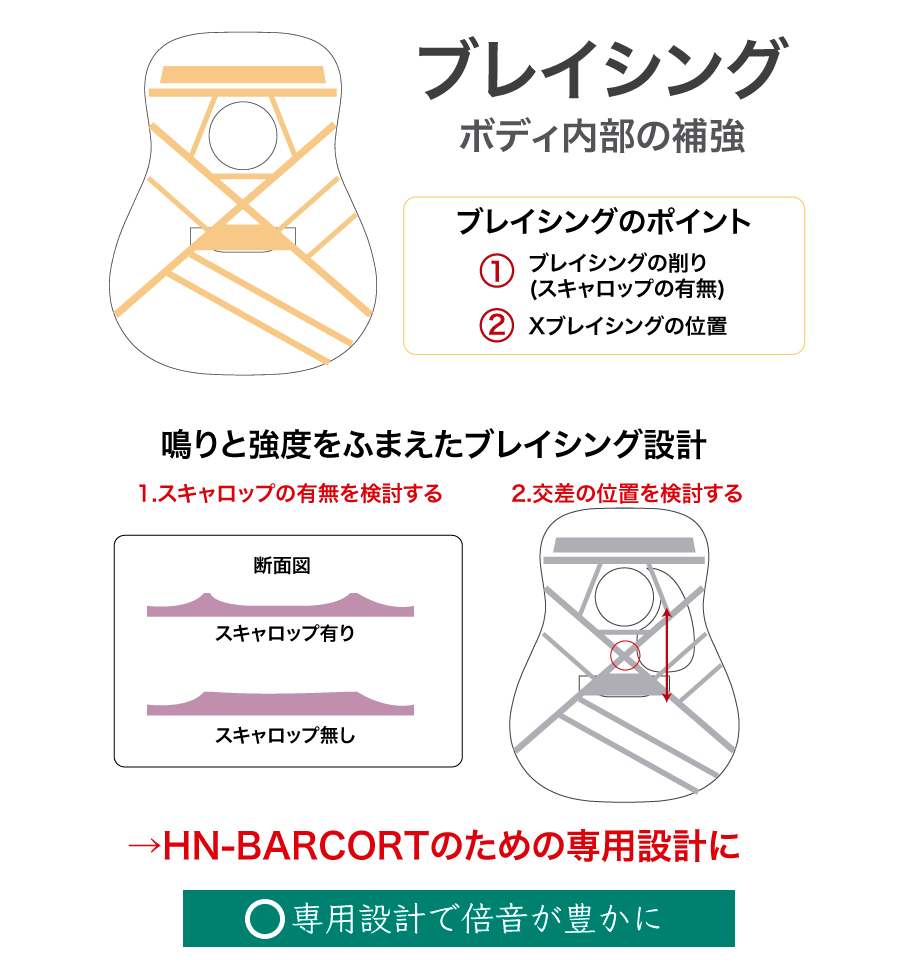HN-BARCORTの開発にあたって、このパターンを見直し、小さいボディでも音の芯が残り、かつボディが振動しやすい、しかも強度を保つための専用設計としました。