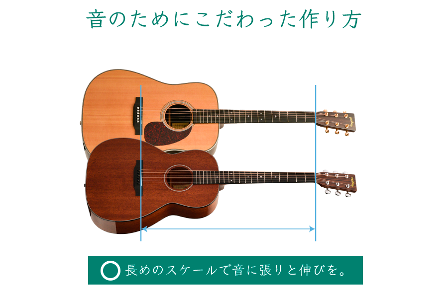 アコースティックギターにおいてもっともサウンドに影響を及ぼすのはボディの形状、そしてスケール、ブレイシングの形状といったギターの構造に関わる部分が大きく、ついで素材である木材となります。