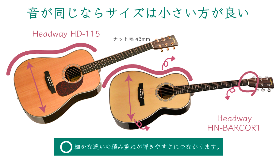 これまでのヘッドウェイHNモデルは628mmスケール・12Fジョイント仕様でいわゆるパーラーギター。抱えやすく弾きやすいのはメリットですが、サウンド面では小さなボディならでは、と言えるような「ポコッ」とした音色になります。これはこれで小さなギターの特徴と呼べるもので、愛嬌のあるいい音なのですが、ドレッドノートやジャンボといったアコースティックギターの王道をいくサウンドとは異なるものです。