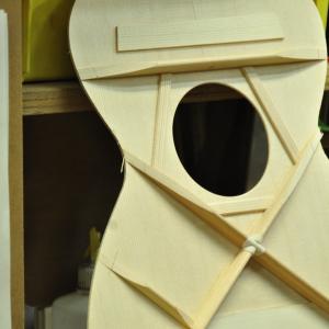 弦振動をボディ全体へ伝えるボディトップは通常、木材の中でも特に振動性に優れたスプルース材が使用され、音量・音色の両方に大きな影響を及ぼしま す。このボディトップが如何に振動するかが、プレイヤーが感じ取る「鳴り」の大部分を決定すると言っても過言ではありません。そこで振動性を高める最も簡単な方法はトップ材の厚さを薄くする事です。