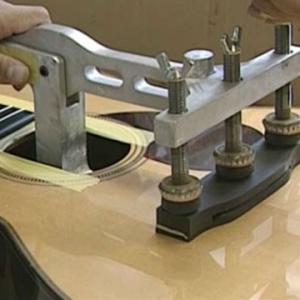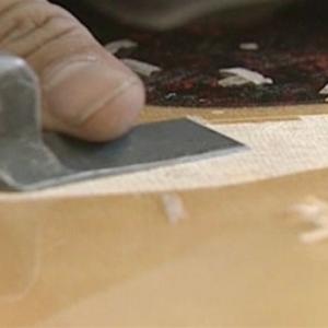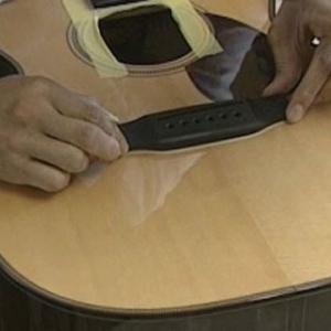 ブリッジを接着する際には接着面に塗料が残っていると十分な接着強度が得られない為、ボディ側のブリッジ接着位置の塗装を全て剥ぎ取る作業を 行っています。ブリッジの形状に寸分違わず、塗装だけを剥ぎ取る作業は非常に神経を使う工程です。