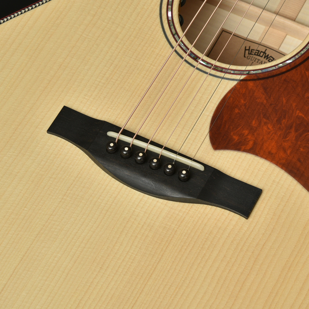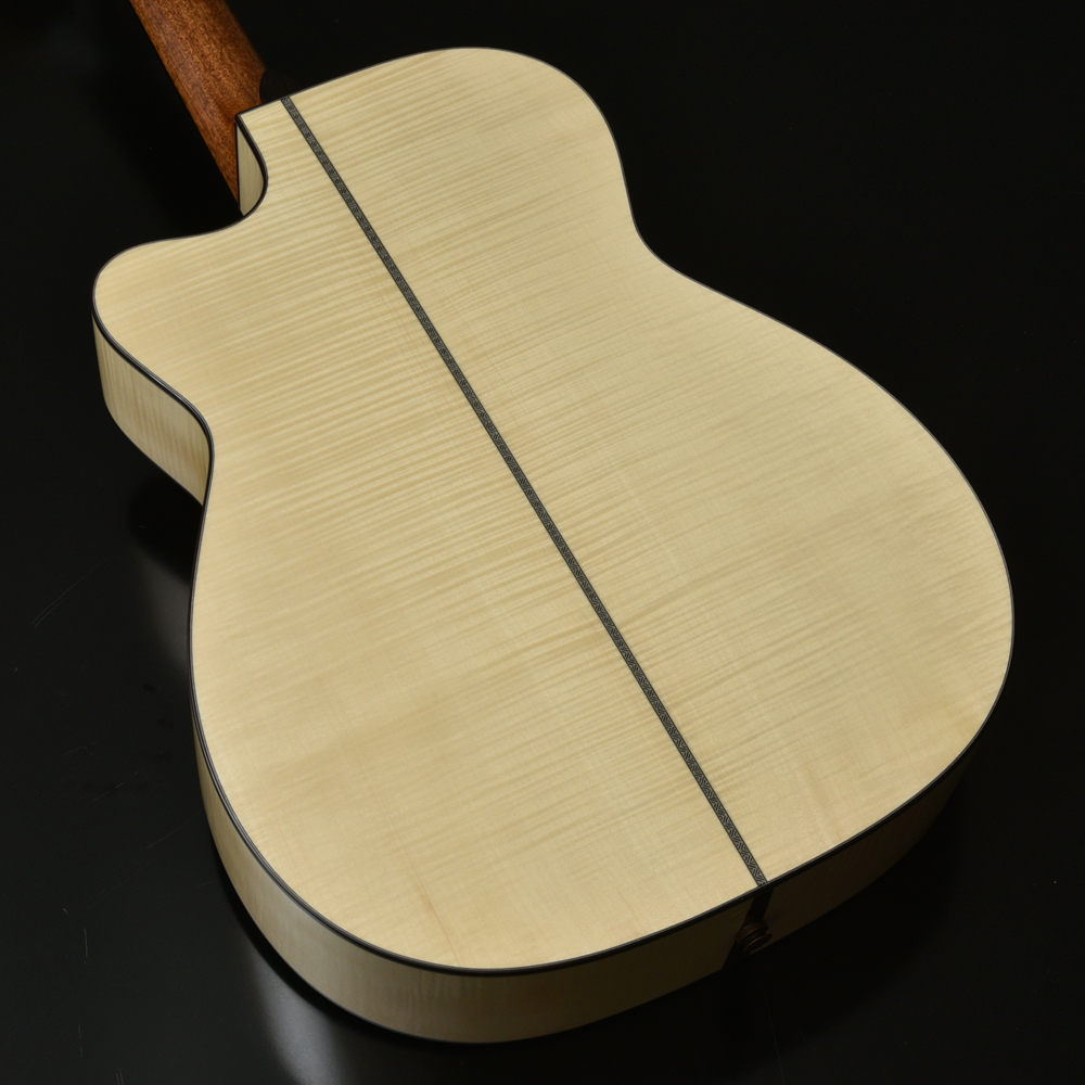 真っ白な木肌が特徴の栃(トチ)の木をボディのサイドバックに使用しました。OMサイズのカッタウェイシェイプである本機では、フレイムトチの程よくカチッとしたまとまりのある音が、生音はもちろん、アンプから大音量で出力したときもバランス良く扱えます。