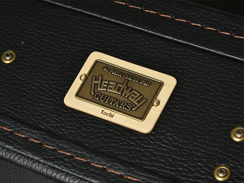 付属するハードケースのヘッドウェイブランドプレートはいつものブラスに加えてボディサイドバック材と同じ材料をレイアウトしました。ブラックのハードケースにワンポイント加わり、複数本のハードケースが並んだときにも一目でこの限定モデルが分かります。