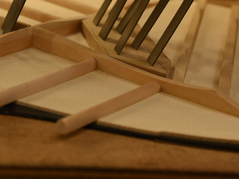 ボディ内部のブレイシングを本モデルに併せて最適化(画像はイメージです)。従来ヘッドウェイのギターづくりでは生音が最も引き出される様に力木を削ります。力木の削り具合は出音に直結するため、強度と音量、鳴りのバランスを見ながら加工を行います。