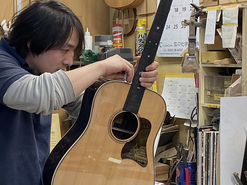 日光東照宮へ行ったときの印象を元に、安井始めヘッドウェイの職人がデザインを進め、完成したギターにはいくつかの装飾が入れられています。この装飾にもご注目ください。