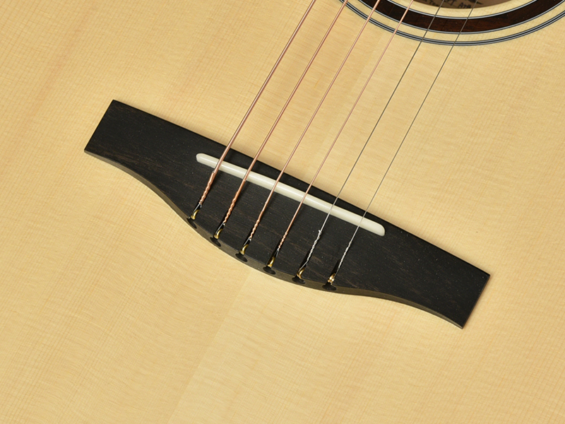 ボディに押し込むブリッジピンを使用しない「ピンレスブリッジ」仕様。従来のブリッジピンで固定される張り方に比べて、サドルへの弦の角度が浅くなることで弦のテンション感も下がります。