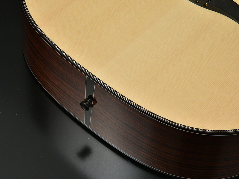 ヘッドウェイで使用されるプリアンプMiSi Acoustic Trioをはじめ、エンドピンジャックを使用する際は、既存のエンドピン用の下穴を拡張する必要がありましたが、本モデルでは予めエンドピンジャックに合せた径で加工しており、それに合せたエンドピンを使用しています。