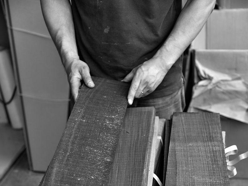 ローズウッドは産地の違いで価値が乱高下する代表的な木材です。希少価値が極めて高いブラジリアンローズウッドの音についての価値は、その密度と硬さにあります。ただし既に材が枯渇している今、この質を担保する良材は皆無です。ヘッドウェイのインディアンローズウッドのストックの中でも目が詰まって硬質な材を選別し、ローズウッドならではの低音の鳴り、高音域の華やかさを生み出します。