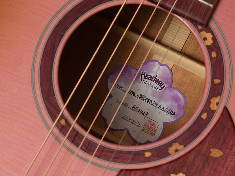 サウンドホールラベルには、桜の形をしたオリジナルデザインを採用。ボディカラーとマッチした淡い紫色を採用しています。