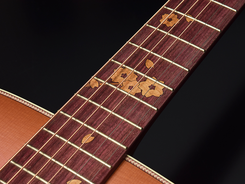 桜ギターモデルでは初の試みである「ロゼッタへのインレイ」を施しています。ヘッドからピックガードまで桜の花びらが舞い散るようなイメージでデザインされています。