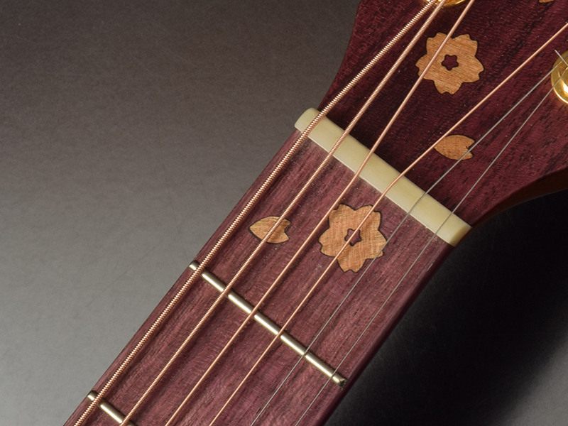ボディのサイドバック材には桜の木を使用しています。適度に優しいニュアンスを持つ桜ギターのサウンドですが、ARS(アドバンスドリアシフト)Xブレイシングの影響からか、立ち上がり良く、音の粒立ちも揃いました。