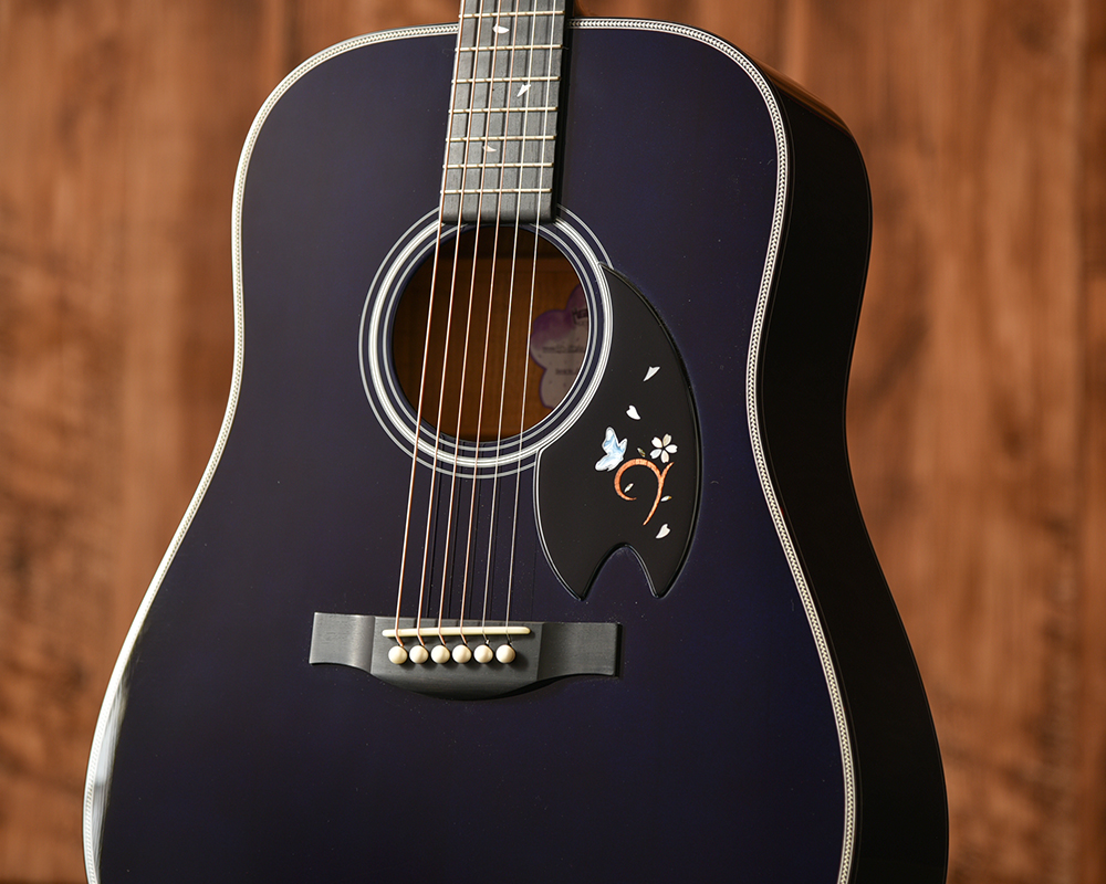 夏限定モデルということで指板インレイも新たに描き下ろしました。桜の花びらに引き寄せられた蝶、その羽の中にさらに桜の花びらが舞うという幻想的なモチーフとなっています。さらに、夏をイメージさせる爽やかなブルーをキーカラーに据え、インレイの輝きもわずかに青みがかっています。