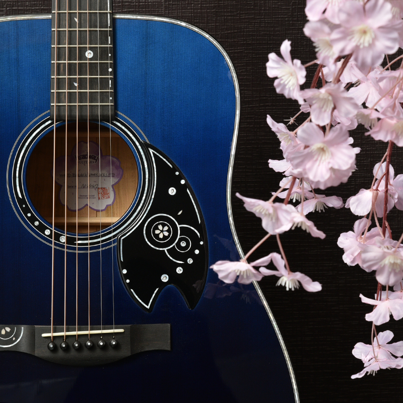 水面にたゆたう桜。その桜によって静かに広がってゆく波紋。夜の静寂を表すような新色「NYGR(夏夜桜グラデーション)」と相まって、ヘッドから指板、ロゼッタ、ピックガードに至るまで上品に飾っています。