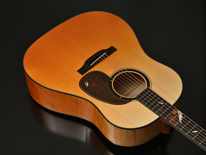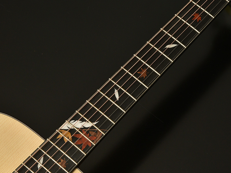 ボディに施したカラーリングは日本の四季の中でも一際情緒のある「秋」をイメージしたオリジナルグラデーションカラー。木材そのもののナチュラルな色から紅葉を思わせる朱色にグラデーションしていきます。ボディ全体の柔らかい暖色を、指板、サウンドホールロゼッタ、ピックガード、ブリッジのエボニーのナチュラルカラーが引き締めます。