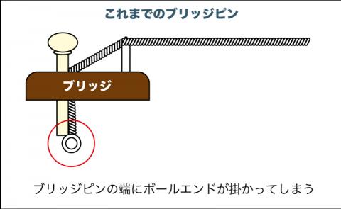 そこで、2019年7月完成分の飛鳥チームビルド製品より、ピンの先端にスラントをつけたヘッドウェイオリジナルブリッジピンに改善しました。