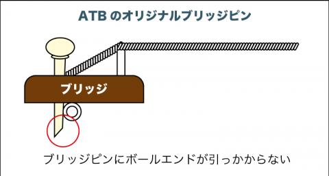 ↑スラントをネック側に向け(←重要)ブリッジピンを差し込むことで、ボールエンドはピンに掛からず、しっかりとボディ側に固定される。