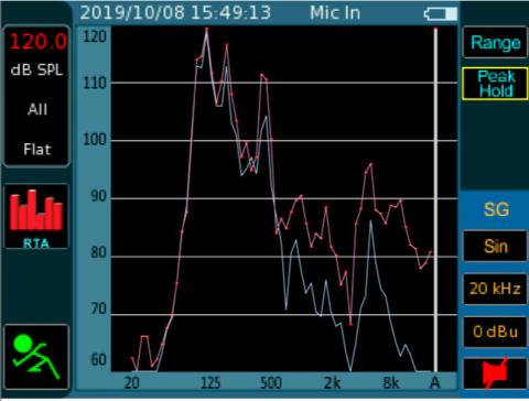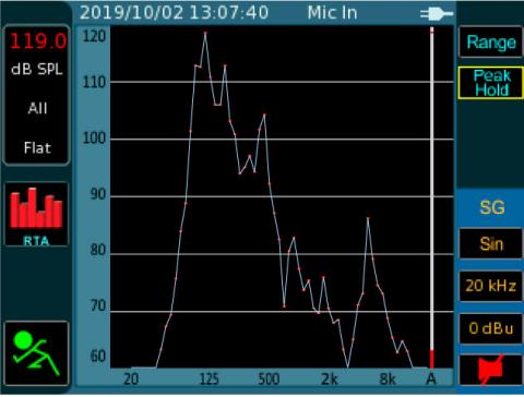 測定画面の横軸は周波数帯(音の高さ)を示していて、右にいくほど高い音。縦軸は音量です。