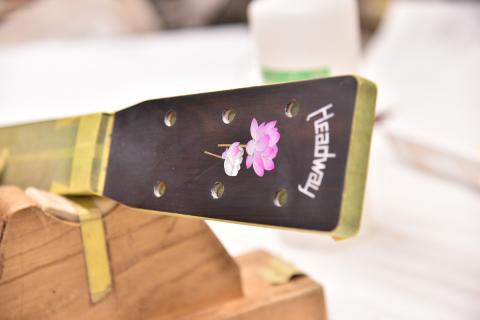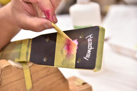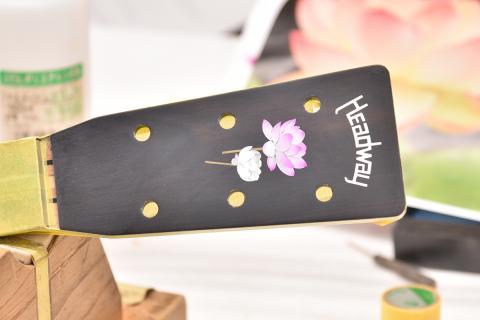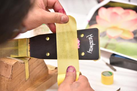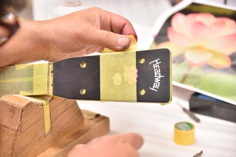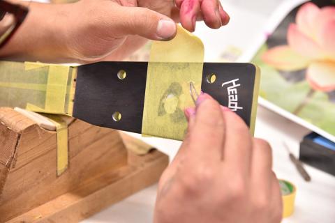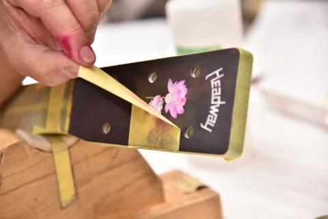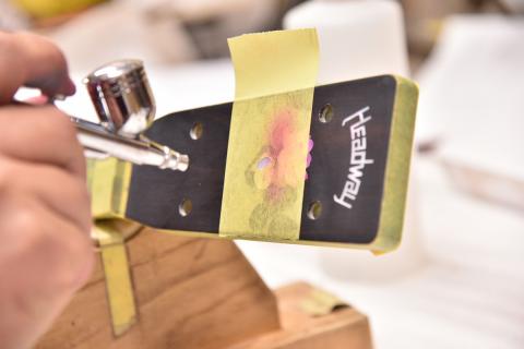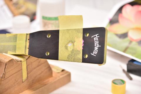 あらわになったインレイに塗料を吹き付け、蓮の花のグラデーションをシュシュっと入れていきます。