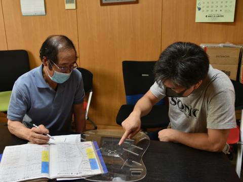 地元にあるため、商品を見にきたりお客様と一緒にオーダーの打ち合わせに来たりフットワークが軽いのが特徴です。アコースティックギターのオーダーを相談されることも多く、知識も豊富でお客様にとって頼りになる存在です。