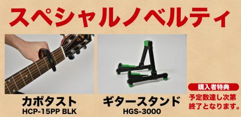 今、この新しくなったJTシリーズをご購入のお客様へもれなくヘッドウェイオリジナルアイテム2種をプレゼント!「ヘッドウェイオリジナルカポタストHCP-15PP BLK」と「ヘッドウェイオリジナルギタースタンドHGS-3000」です。