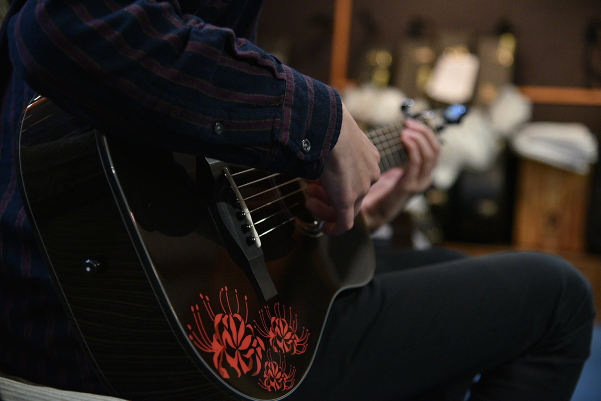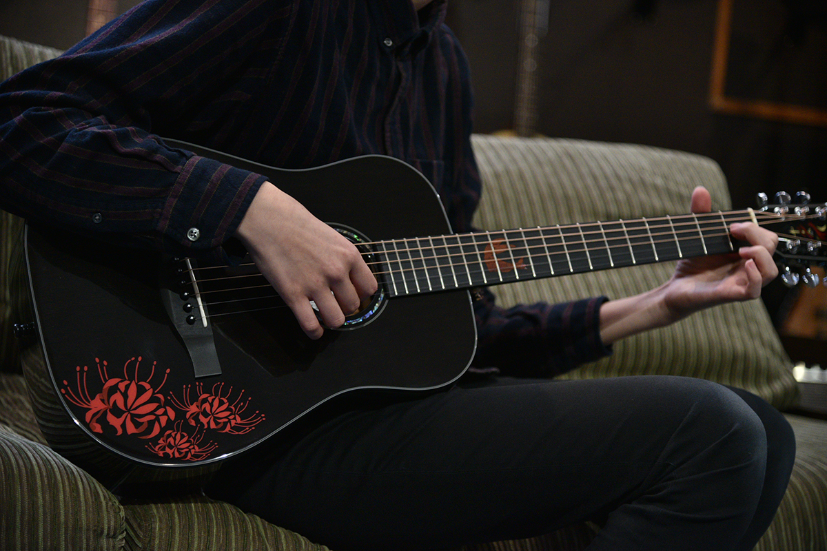 おさむらいさんのオリジナル楽曲「相思花」(彼岸花の別名)から着想を得て、赤い彼岸花のデカールをボディに入れました。ギターを抱えたときに花が上を向くように、敢えて向きを傾けて配置してあります。