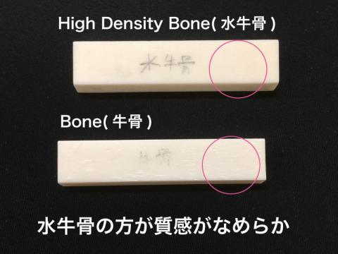 今回こだわったのは言ってみれば「骨密度」。牛骨であっても、部位や個体差により、骨の密度が高いところと低いところが存在します。密度が低い箇所だった場合、ナット材を見るだけでもわかるほどに「す」が入っていたり、質感もスカスカしたものになってしまいます。