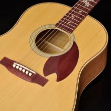 ヘッドウェイで使用される桜の木は山桜や本桜といった日本古来より親しまれている桜を使用しています。また飛鳥チームビルドに使用される桜はフレイム杢が入った特別な個体を厳選して使用しています。サクラのイメージを生かし、ヘッドから指板にかけてサクラの花びらをモチーフとするインレイが入り、更にピックガードも花びら型に。ヘッドから指板、ピックガード、ブリッジには「パープルハート」という紫色の希少材をナチュラルカラーで使用しました。