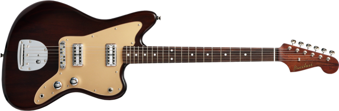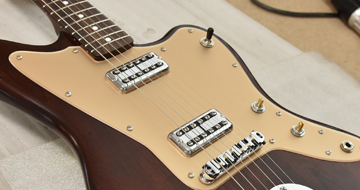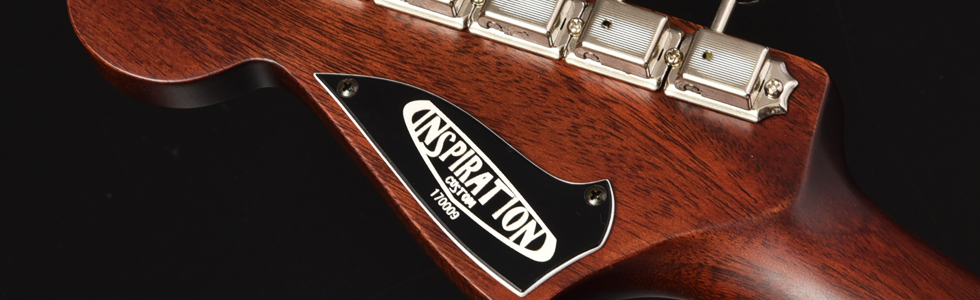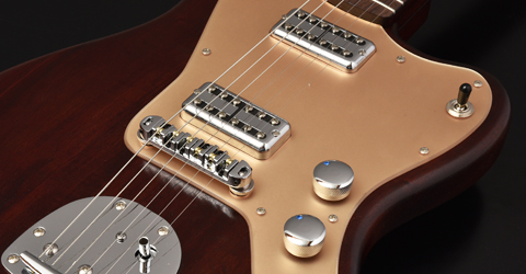 ピックガードはゴールドカラーを採用。ボディのブラウンオイルカラーとマッチして上品な外観へと仕上がっています。ボディ・ネックともにマホガニーを採用し、暖かみのあるミッドの効いたサウンドをお楽しみいただけます。ブリッジにはローラーブリッジを採用。弦落ちのトラブルも改善され、トレモロ使用時のチューニングのズレもなくなり、ストレスなく演奏頂けます。