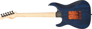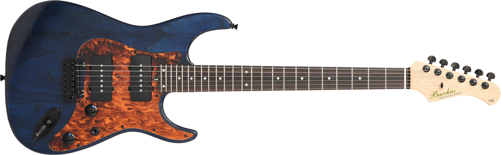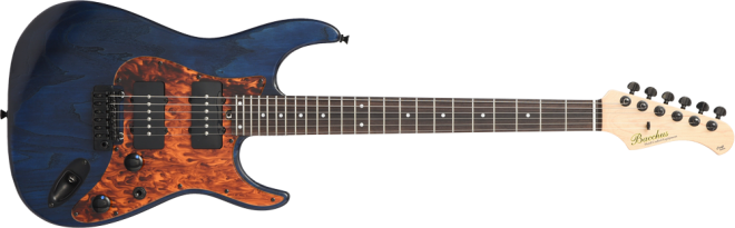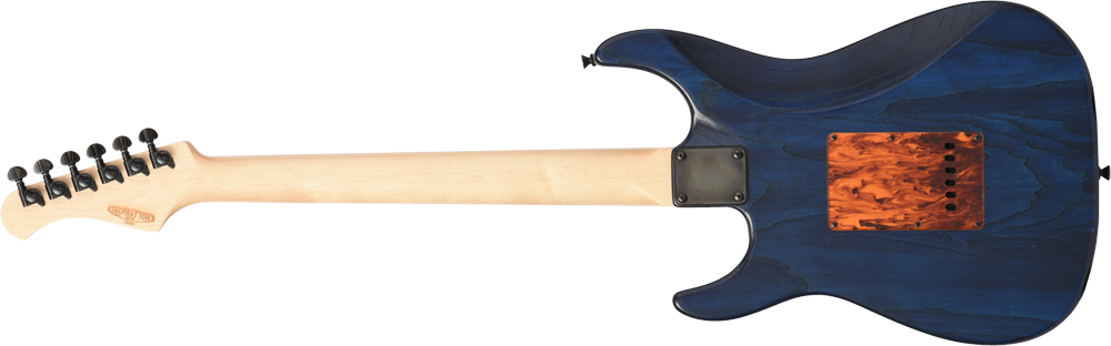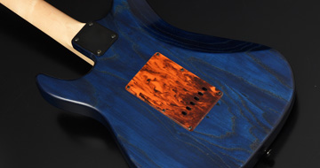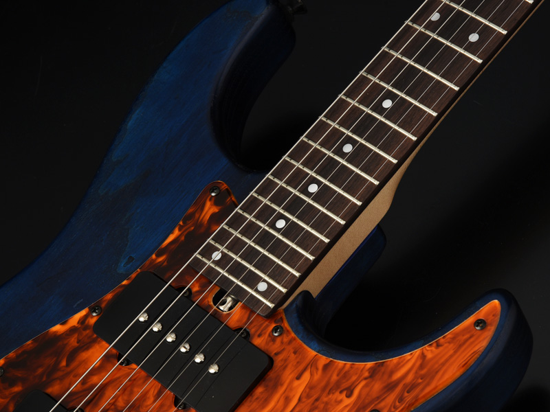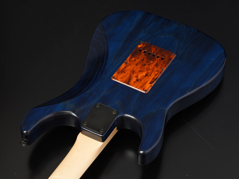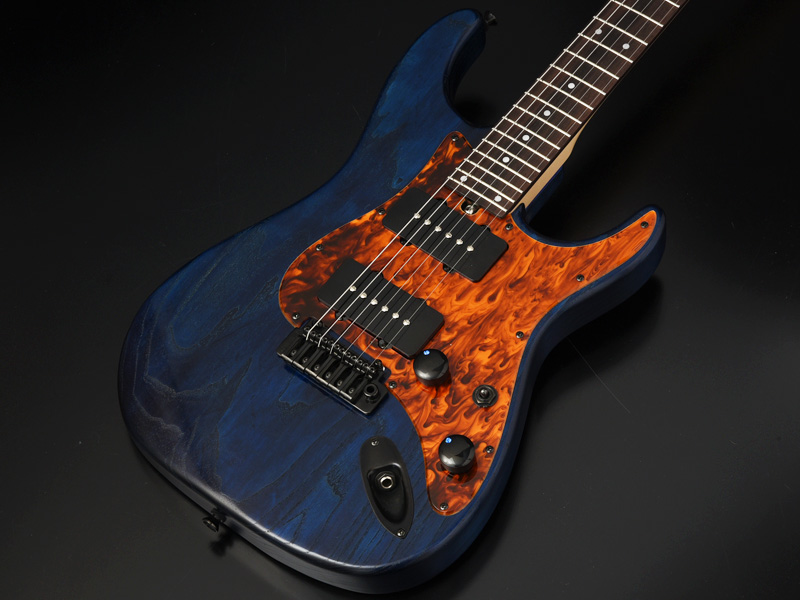 ブリッジにはGOTOH社の"WILKINSON/VG300"を採用。ノブには直系25.3mmと少し大きめのメタルノブを採用し、Blue Cubicで視認性も抜群です。アッシュボディの木目を活かしたオイルフィニッシュ塗装、ピックガードとバックパネルには1プライのべっ甲柄を採用し、いちから制作を行いました。高級感のある1本に仕上がっています。