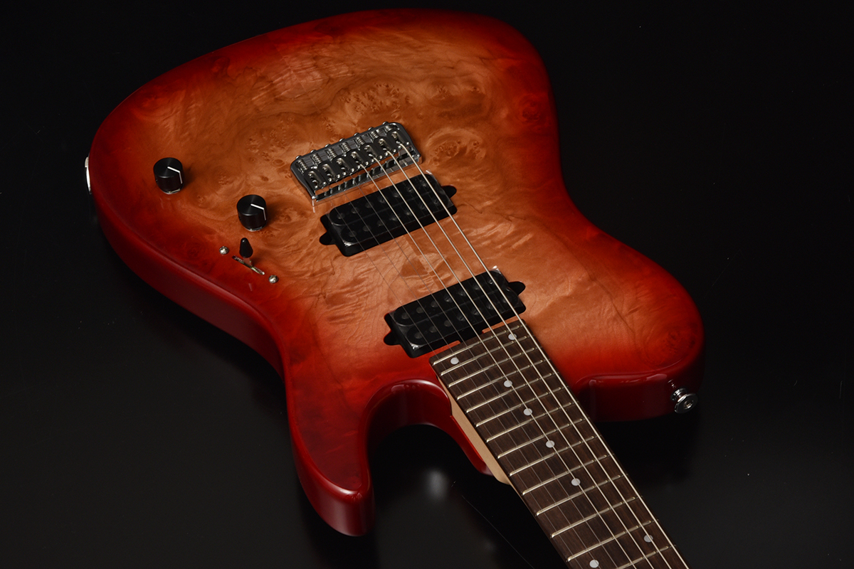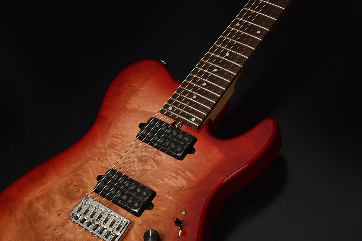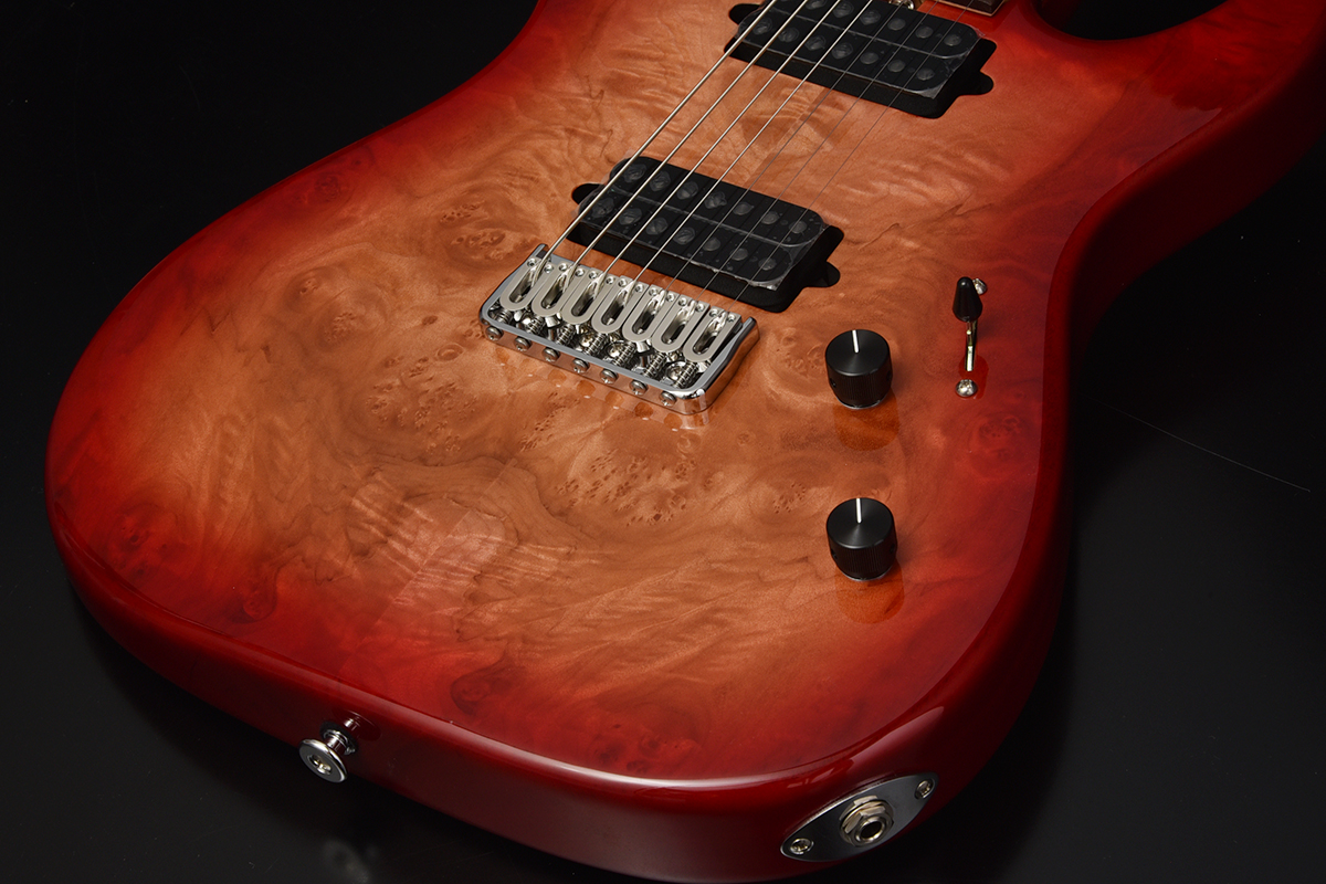 ブリッジにはレギュラー製品では使用されることが少ないHipshotを搭載。ボディトップはバールメイプルを採用。美しい杢目を活かすためにレッドバーストカラーで仕上げました。