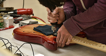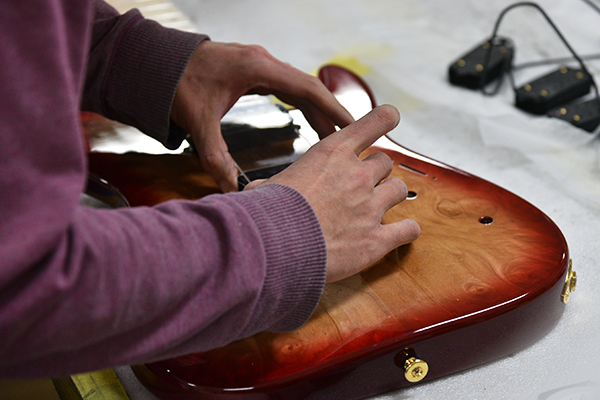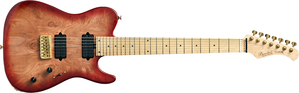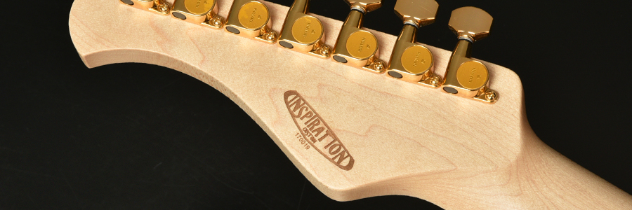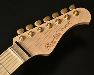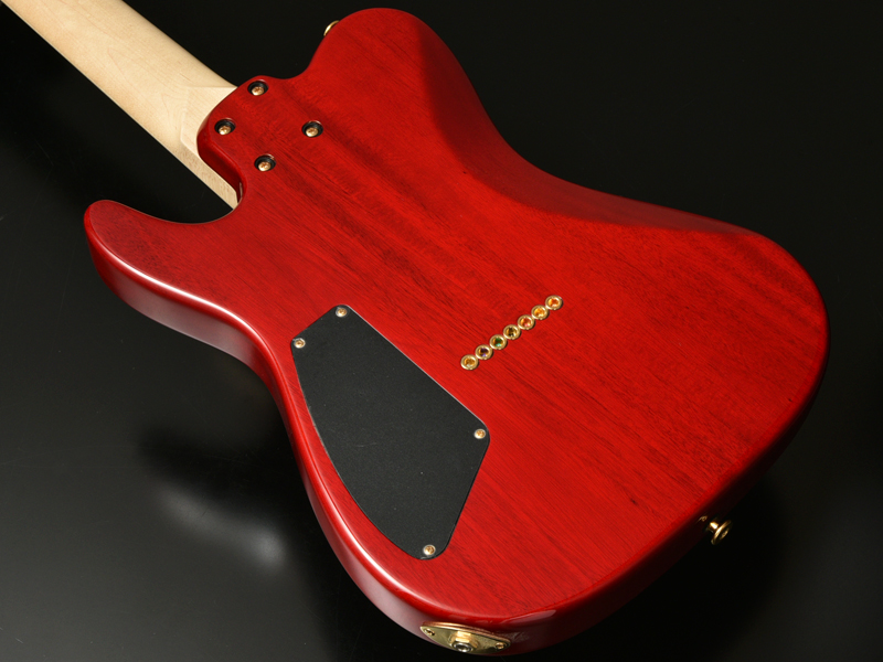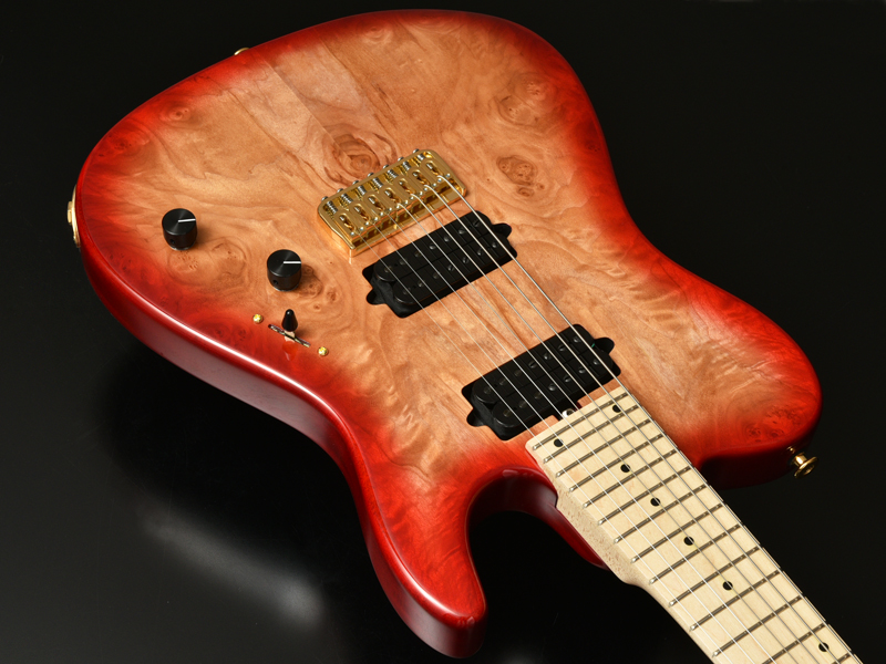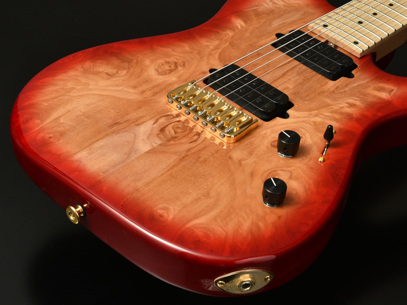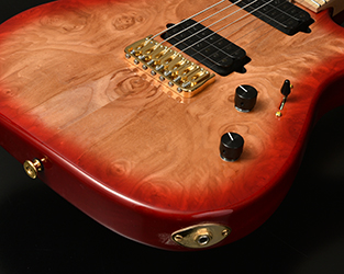ブリッジにはレギュラー製品では使用されることが少ないHipshotを搭載。ボディトップはバールメイプルを採用。美しい杢目を活かすためにレッドバーストカラーで仕上げました。