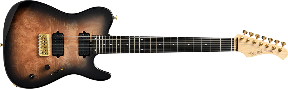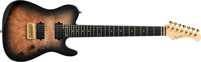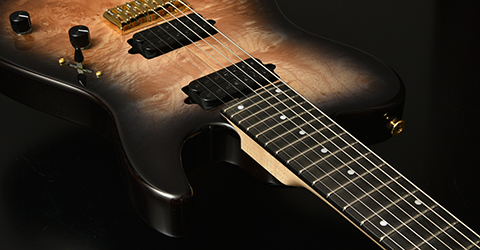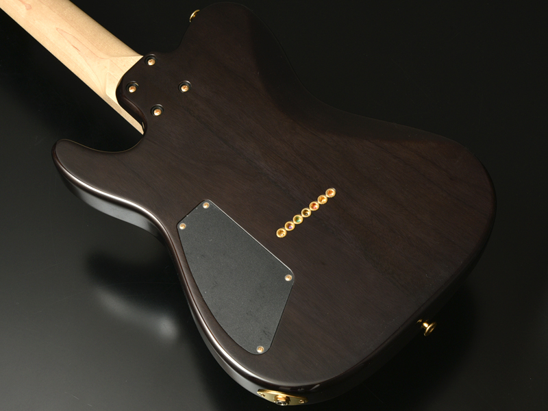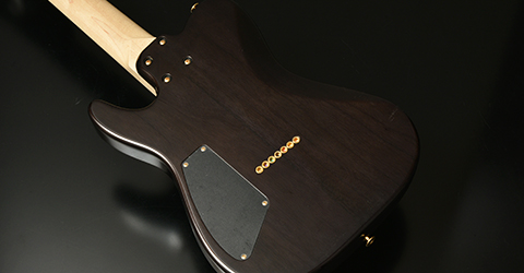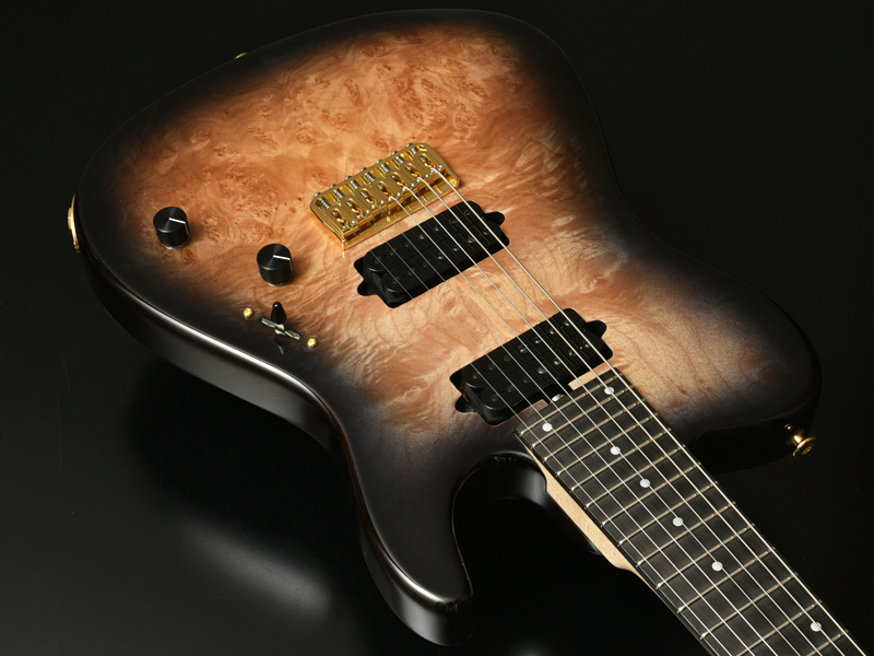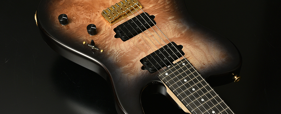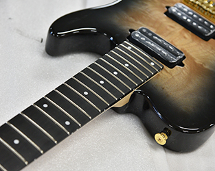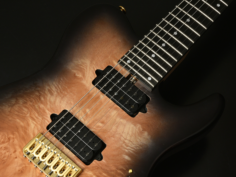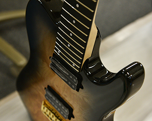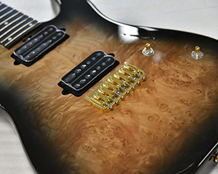 ブリッジにはレギュラー製品では使用されることが少ないHipshotを搭載。ボディトップはバールメイプルを採用。美しい杢目を活かすためにブラックバーストカラーで仕上げました。