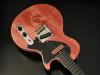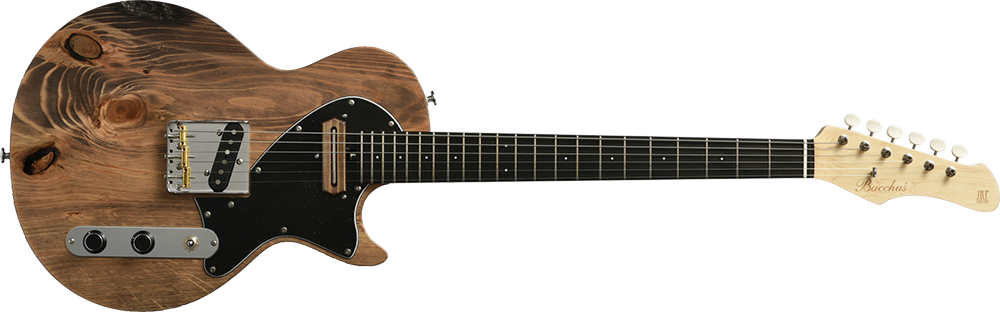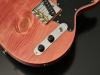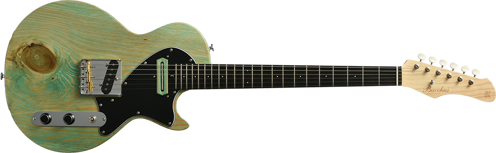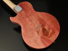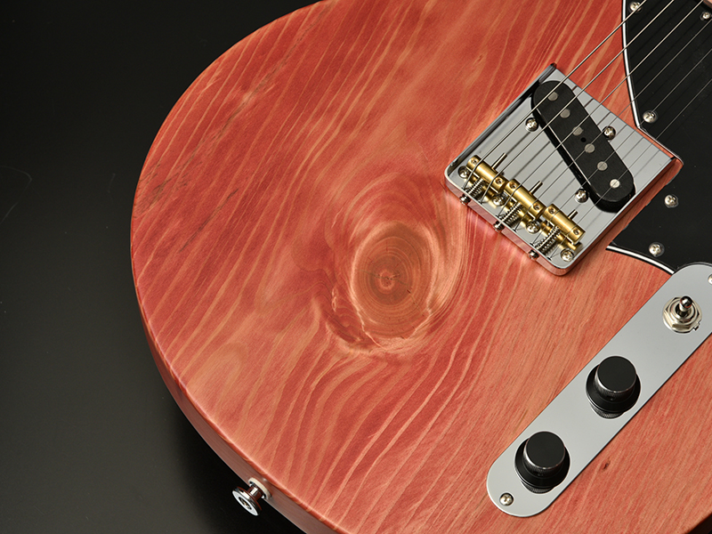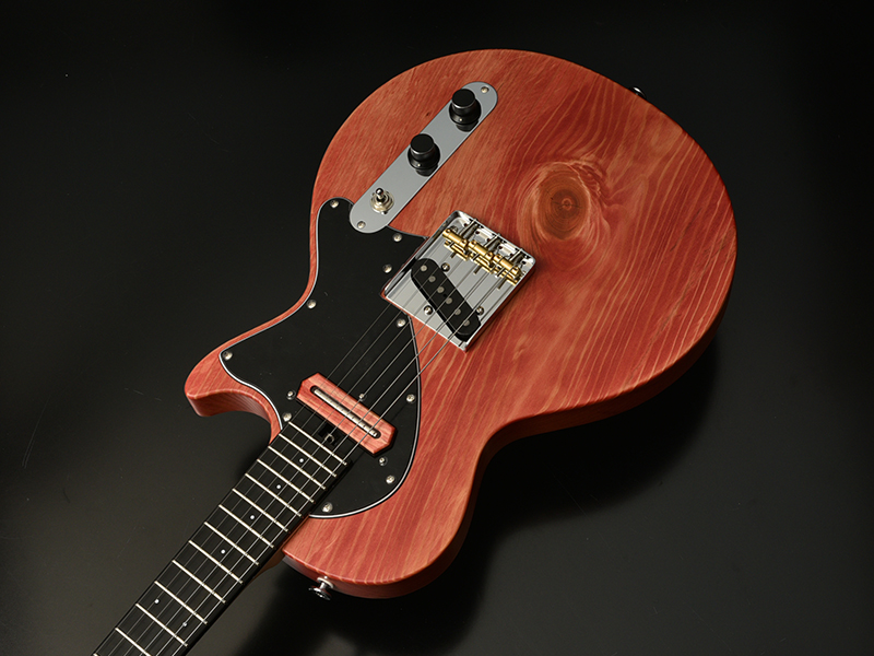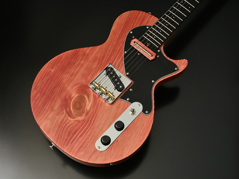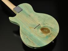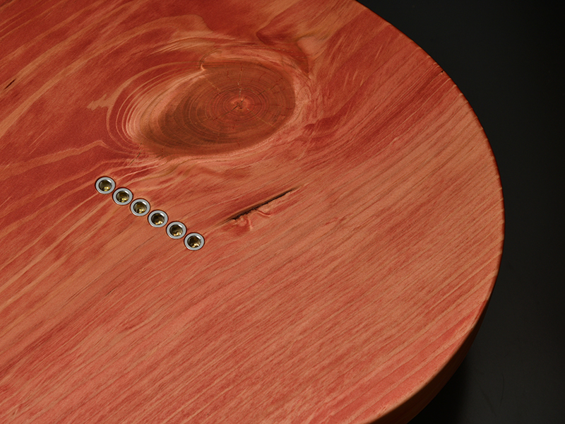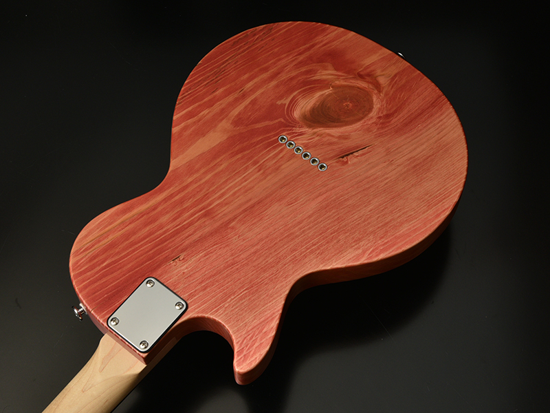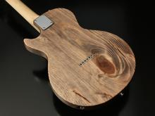 ボディの表から側面にかけて貫通する虫食いの穴、枝や根になろうとした形跡である節、局所的に変色したシミ、一般的なギター作りで嫌われる場所を全て含んだこの木材の個性を受け入れ、あえてその特徴を強調してこのギターのオリジナリティとして捉えてもらえるように様々な工夫を凝らしました。