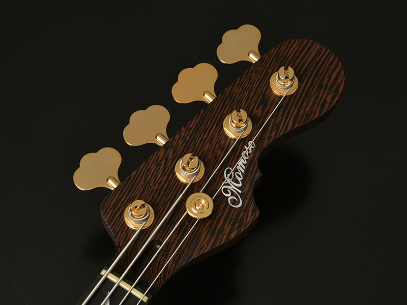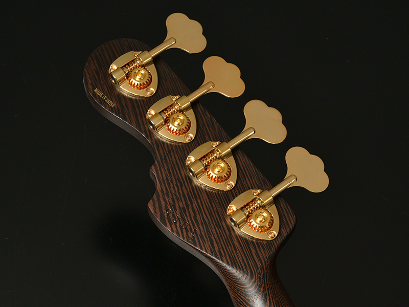 Wenge:ネックに使用されているWengeは、リップルマークとよばれるさざ波のような木目が特徴的なアフリカ産の木材です。肌目は粗いが大変強度が高く、硬いことから特異な木材として知られています。その音は硬さはなく、重厚感や存在感のある中低音域に魅力を感じます。