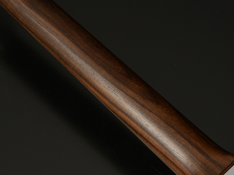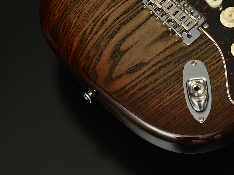 材料や原料のために伐採された木々ではなく、倒木が水や火山灰、地中の中で腐敗することなく幾年もかたちを残すことがあります。その土や水、灰のなかで埋もれていた木のうち、千年以上埋もれていたものは「神代木」と呼びます。神代木は偶然でしか見つけられず、土砂災害や土木工事の際、稀に姿を現します。一般的にタモ材は野球のバットなどに使用され、木目は豊かで色は白いのが特徴です。また、楽器に使用される木材のなかではアッシュに良く似ているといわれています。この神代タモは、無着色の段階で深く鈍い灰色をしています。おそらく灰や地中の成分が影響しているのでしょう。さらにカーリー杢やフレイム杢といわれる杢を有し、塗装された段階では人工では生み出せない深みを感じます。この杢がでた神代タモは和材のなかでも別格の希少性を誇り、工場のなかでも希少材中の希少材です。
