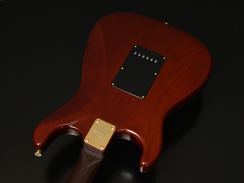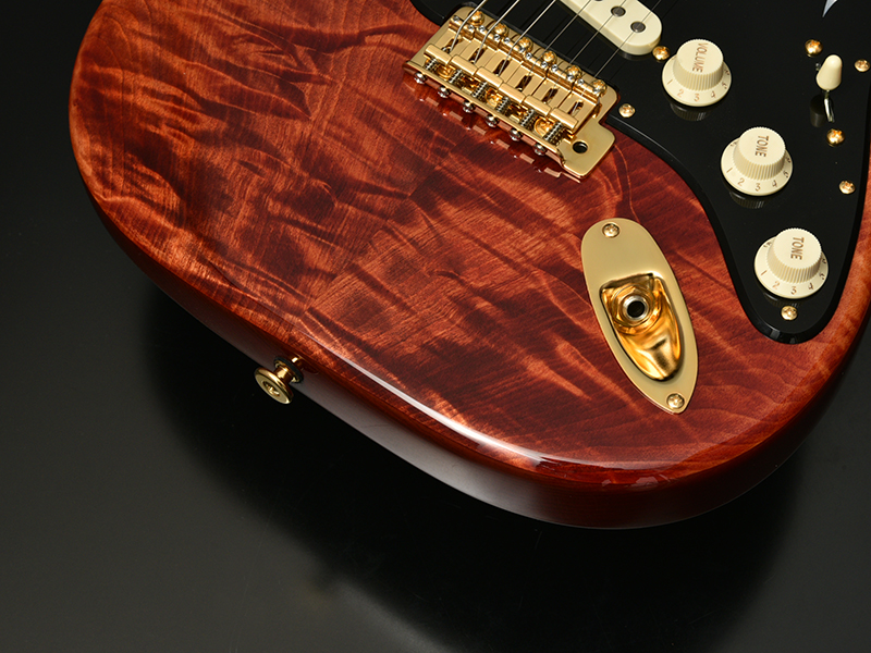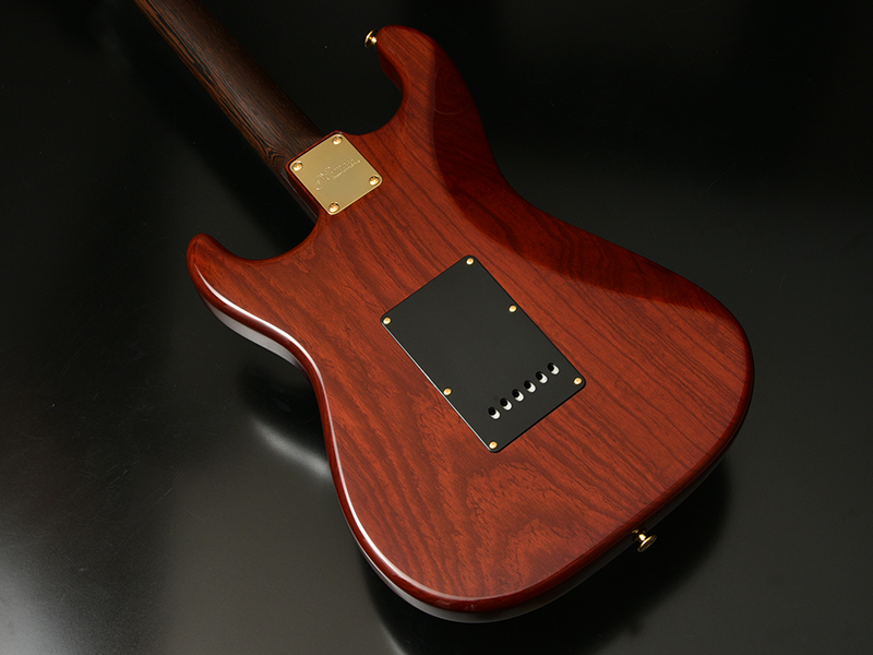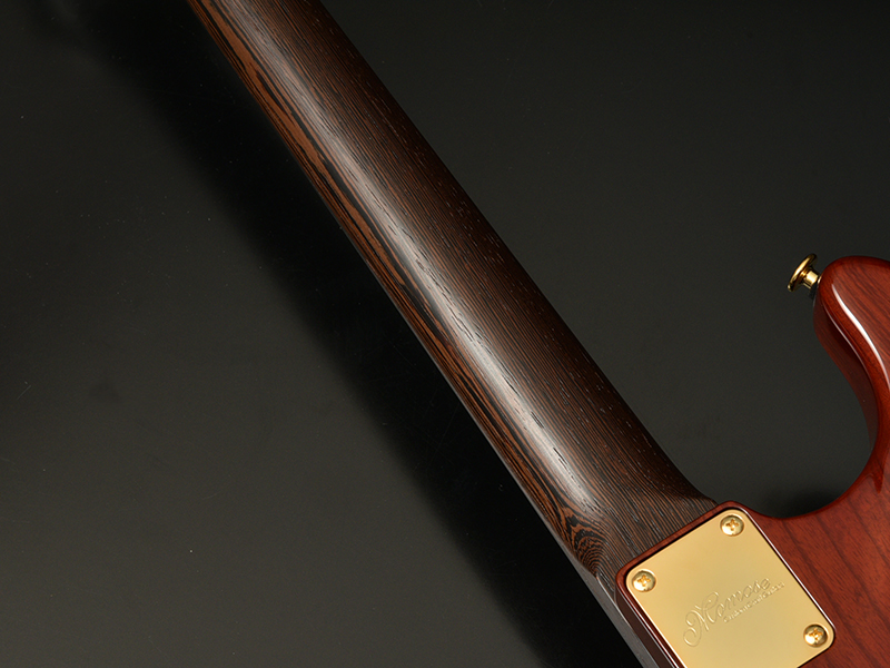 Wenge:ネックに使用されているWengeは、リップルマークとよばれるさざ波のような木目が特徴的なアフリカ産の木材です。肌目は粗いが大変強度が高く、硬いことから特異な木材として知られています。その音は硬さはなく、重厚感や存在感のある中低音域に魅力を感じます。
