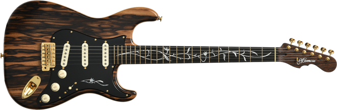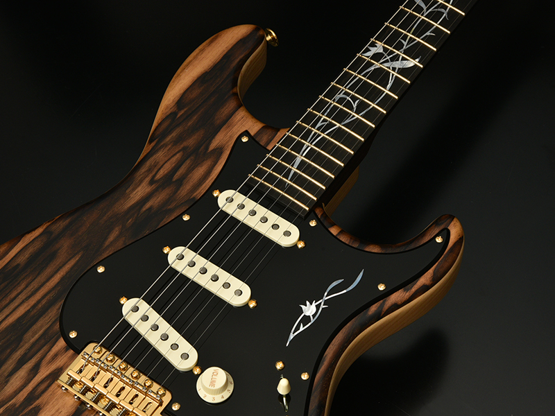 Kurogaki:ボディトップには日本の銘木"黒柿"を採用。水墨画のような紋様は、日本古来より庶民から公家や武家まで、多くの人々が魅了されたといわれています。 「黒柿」とよばれるものは、柿の古木の数万本に一本に現れるとされ、その希少性と美しさから、あらゆる工芸品の中でも最高級に位置するものに使用される「銘木中の銘木」とも呼び声高い希少木材です。木目を活かすナチュラルカラーで仕上げました。